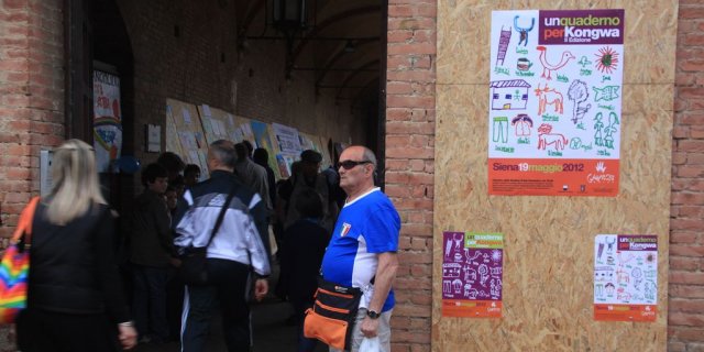 Oltre settecento persone, tra cui tanti bambini, hanno affollato sabato 19 maggio il Chiostro della Basilica di San Domenico, a Siena, per visitare la mostra allestita al termine della seconda edizione dell’iniziativa “Un quaderno per Kongwa”, promossa dalla Onlus Gabnichi per sostenere progetti d´istruzione scolastica in due scuole nella località di Kongwa, in Tanzania. I quaderni messi in vendita a scopo benefico - realizzati con alcuni dei disegni scaturiti dalla fantasia e dall’immaginazione dei circa 900 bambini, tra scuole primarie e dell’infanzia, che hanno partecipato al progetto didattico e culturale - sono andati tutti esauriti, a conferma dell’originalità dell’iniziativa e della sensibilità dei tantissimi senesi che hanno scelto di partecipare e sostenere l’associazione nel suo impegno verso l’istruzione dei piccoli studenti africani. A ricordare Padre Corrado, il frate recentemente scomparso a cui è stato dedicato il progetto, è stato Padre Leonardo, che ha testimoniato il continuo impegno missionario dei frati Cappuccini e il sodalizio con l´associazione Gabnichi sia per la realizzazione della scuola primaria di Kongwa, che per l´asilo di Mkoka.
